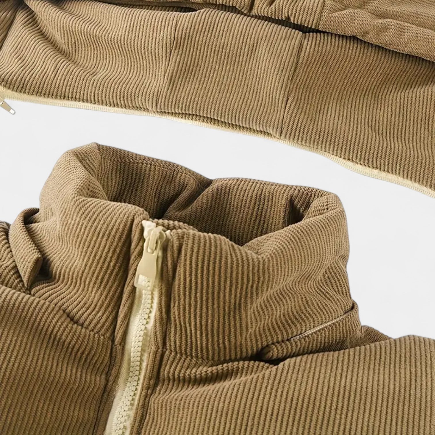 - Corduroy trim: Refined texture at hood, shoulders, and collar