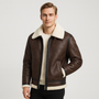 This jacket has a zip-front closure and a throat latch at the collar. The outer shell is made from genuine cow leather, and the interior is lined with shearling. It includes welt hand pockets and a collar. The seams and trims are visible, defining the jacket’s structure.