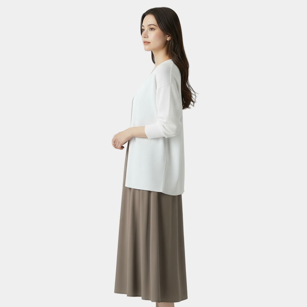 Subtle and sophisticated, this women’s long-sleeve cardigan is defined by its clean lines and refined simplicity. Crafted with a uniform knit texture that offers gentle stretch, it drapes effortlessly for a smooth, tailored silhouette. The V-shaped neckline and concealed hook-and-eye front closure create a polished, minimalist look, while the straight cuffs and hem maintain structure and balance. Perfect for layering over blouses or dresses, it brings quiet elegance to both casual and elevated occasions.